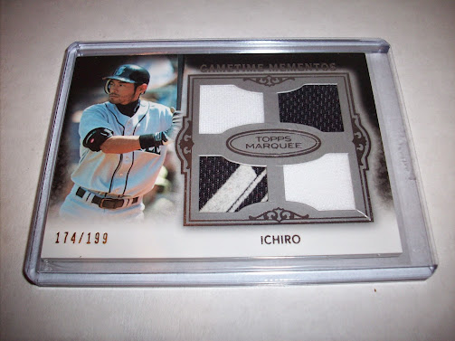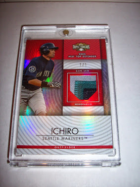 Well not really a piece of Ichiro, that would be kinda gross. More like a piece of Ichiro's jersey. I guess that's not as weird according to the outsiders but the complete norm and totally amazing to the collecting community. Finding great looking jersey/relic/patch are always in high demand for many especially for their PC players. Having a bit of color and variation to the patches make it all the better. These are a few of my favorites. The 2011 Topps Marquees are high numbered but have amazing patches nonetheless and these include a nice looking patch & the other has a part of the majestic patch. The other 2 are 2012 Triple Threads which had 2 variations of Ichiro and these have nice patches as well. They are extra special to me since they are both Ruby 1/1 patches.